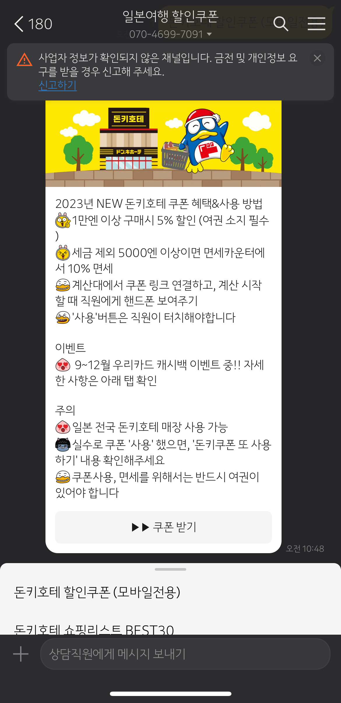 돈키호테 할인쿠폰을 누르게 되면 카톡으로 전송됩니다.