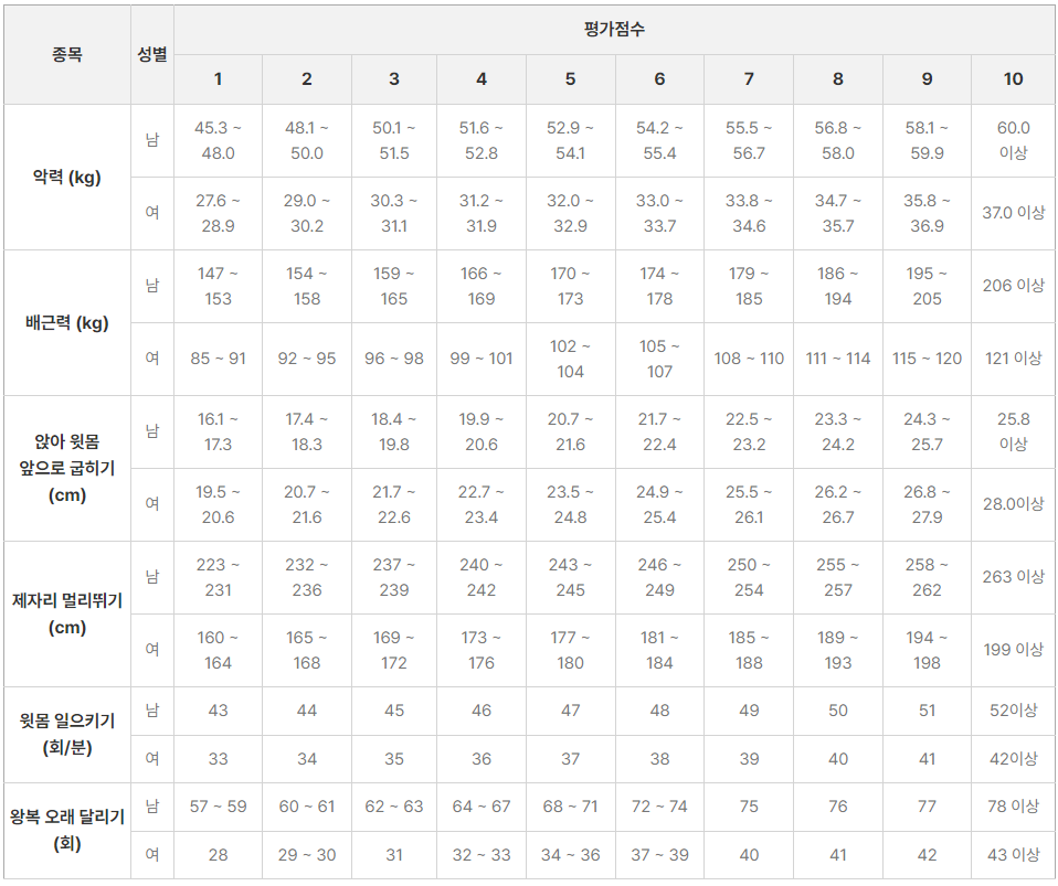 체력 평가점수는 종목마다 1~10점으로 나뉘며