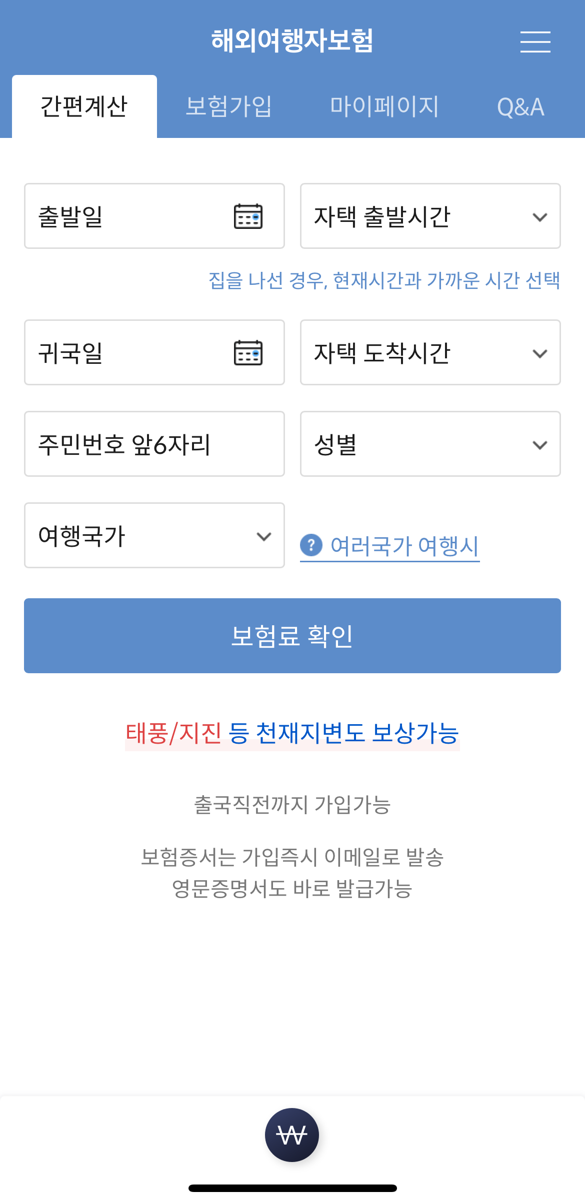 생년월일과 여행국가도 입력해 줍니다.