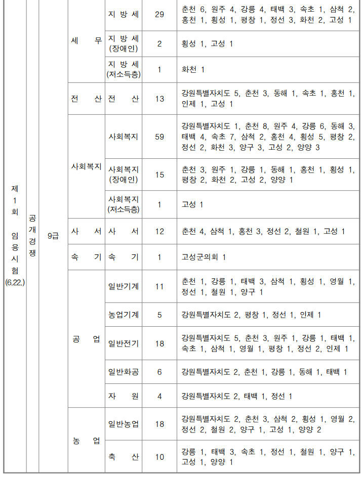 9급 행정직 368명, 세무직 32명, 전산직 13명, 사회복지직 75명, 사서직 12명, 속기직 1명,