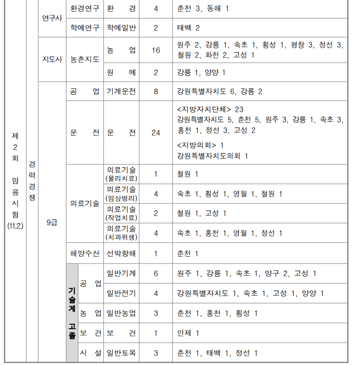 공업직 44명, 농업직 28명, 녹지직 21명, 해양수산직 5명, 보건직 22명, 식품위생직 2명, 환경직 17명,