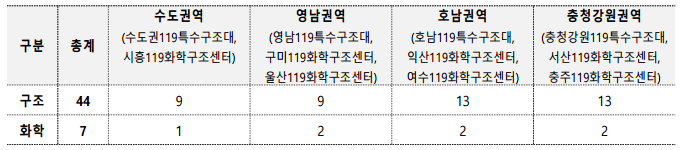 영남권역은 영남119특수구조대, 구미 119 화학 구조센터, 울산 119 화학 구조센터이고