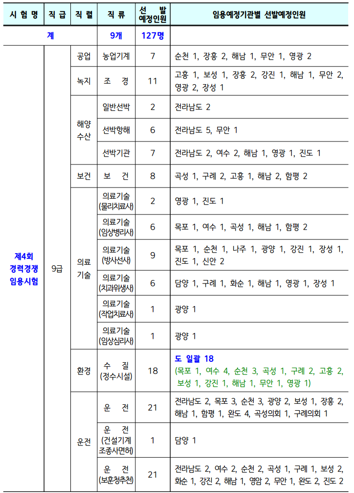 녹지직 25명, 해양수산직 17명, 보건직 10명, 식품위생직 8명, 환경직 33명, 시설직 144명,