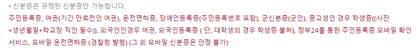신분증 반드시 지참해야 하고 가능한 신분증 종류는 아래와 같습니다.